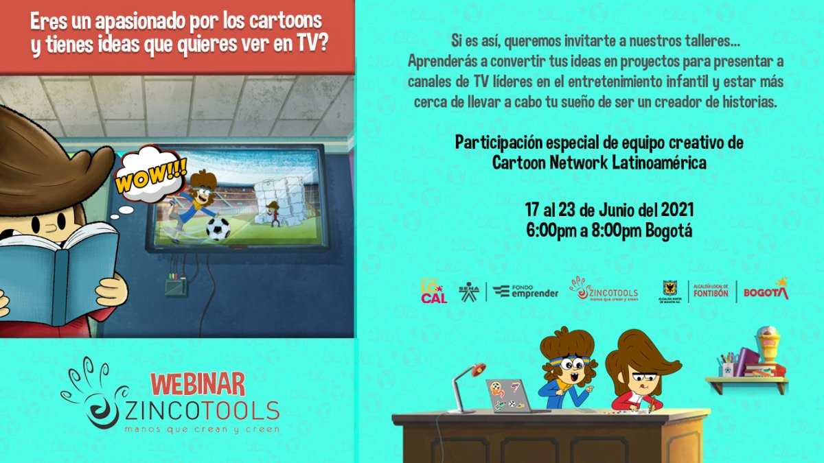 En nombre del Zincotools estudio de animación ubicado de la ciudad de Bogotá y en compañía del SBDC Centro de Desarrollo Empresarial de la Regional Distrito Capital y la Alcaldía Local de Fontibón agradecemos su interés en participar en nuestros servicios y nos complace en invitarlos a participar de estos Webinars (no tienen costo), un espacio abierto en compañía de nuestro equipo Zincotools y parte del equipo del Canal Cartoon Network a desarrollar estos talleres sobre "IDEAS PARA ANIMACIÓN - UNA GUÍA PARA PRESENTAR PROYECTOS” dirigido a estudiantes, formadores, orientadores y personas interesadas en desarrollar contenidos creativos de Animación que quieran presentar sus proyectos a las grandes Industrias de Animación.