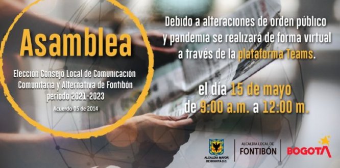 La Alcaldía Local de Fontibón informa que, de acuerdo al proceso que se viene realizando con la elección del Consejo Local de Comunicación Comunitaria y Alternativa de Fontibón 2021-2023, y acatando las medidas decretadas por Alcaldía Mayor de Bogotá, el encuentro que estaba agendado para el 12 de mayo será reprogramado para el próximo sábado 15 de mayo de 2021 y se realizará a través de la plataforma Teams, en el horario de 9:00 a.m. a 12:00 m.
