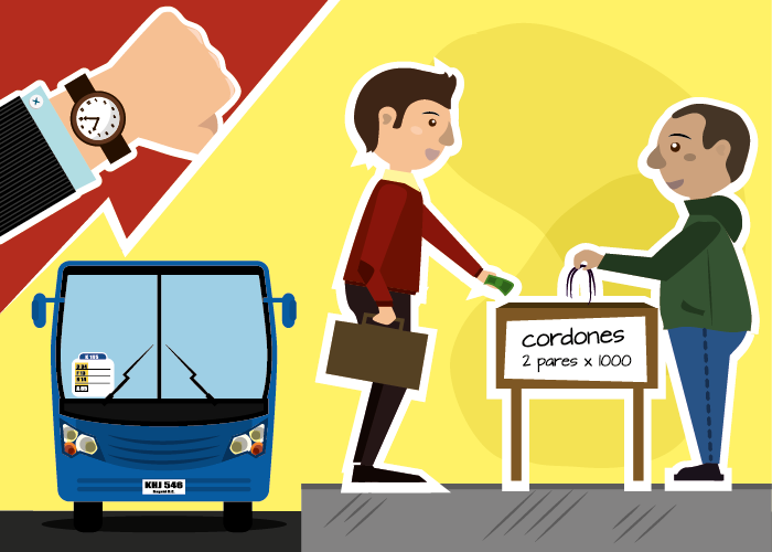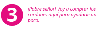 Pablo va para el trabajo y hoy salió más tarde que de costumbre. Cuando se baja del bus, cerca de su oficina, encuentra un vendedor de cordones instalado en la mitad del andén. Cuando lo ve, recuerda que los cordones de los zapatos de su hijo se rompieron ayer y que su esposa le pidió comprar unos. Pablo se decide a comprar los cordones al niño.