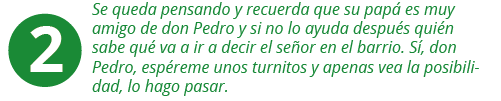 Don Pedro ha llegado a la oficina de atención al ciudadano de una entidad del Distrito. Cuando entra observa que van en el turno 456 y a él le ha tocado el turno 601. Mientras espera, se da cuenta que una de las personas que atiende es el hijo de un vecino. Se acerca a saludarlo, le preguntar por su familia y le pide que lo atienda ya porque tiene unas diligencias muy urgentes por realizar.